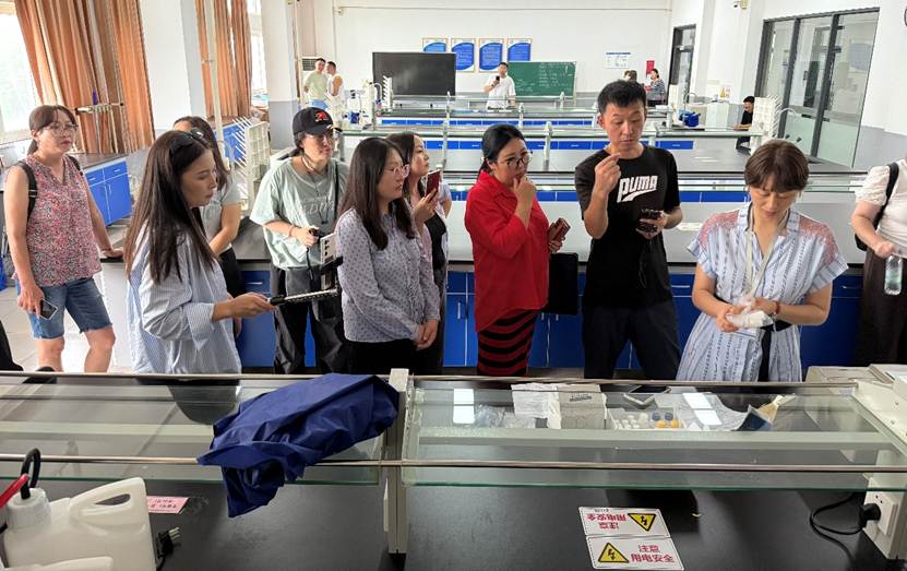 研修班学员先后参观了校检验检测认证学院现代测试分析中心、食品检测实训室及化工学院精馏实训室,实地考察了农食产品检测全流程的技术应用场景。检验检测认证学院副院长李运山详细介绍了学院在农食产品检测领域的硬件配置与技术优势,重点展示了气相色谱-质谱联用仪、高效液相色谱仪等精密仪器设备。