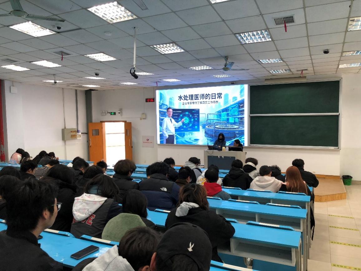 何旭红工程师巧妙地将自己的日常工作比作"医生诊病",围绕"水处理医师的日常"这一主题,生动分享了他为不同企业污水处理系统进行故障诊断、方案设计的实战经验。他通过鲜活案例展示了环境工程水处理领域的实际工作场景,并以通俗易懂的方式深入讲解了污水处理的理论框架与技术要点。现场学生专注聆听,在互动环节积极提问,何工程师耐心解答,并特别强调"水处理不仅是技术活,更是对生态责任的坚守"。