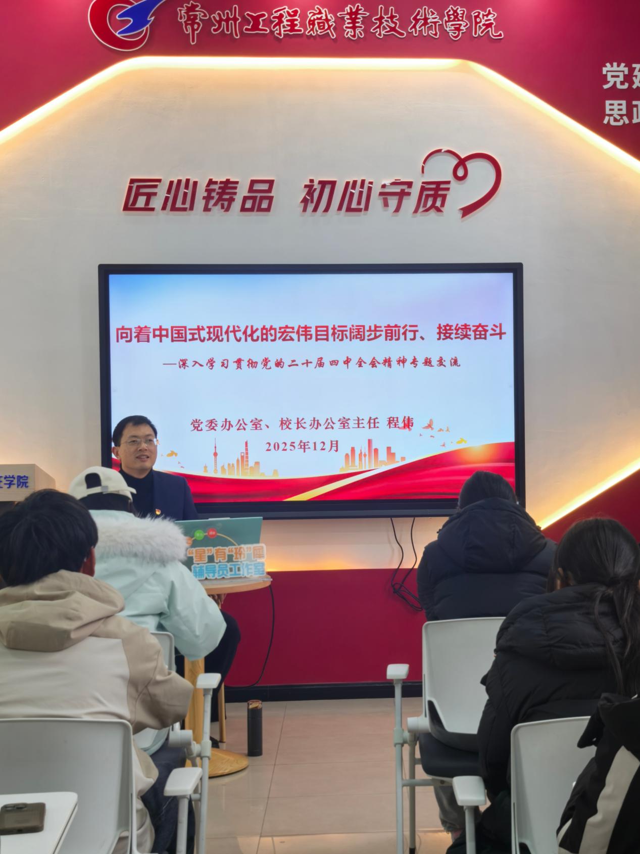 聚焦骨干引领,深化理解认识 学院高度重视学生骨干和入党积极分子的思想引领作用。12月12日,学院特邀党委办公室、校长办公室办主任程伟为检测学院全体入党积极分子、主要学生干部进行专场宣讲。宣讲围绕当前形势与青年学生思想实际,结合检测专业如何对接高质量发展需求等问题,系统阐释了全会精神的里程碑意义,深入解读了全会提出的一系列新思想、新论断、新部署。同时,勉励在场学生要先学一步、多学一层,自觉用党的创新理论武装头脑,将学习成果转化为坚定理想信念、提升综合素养、服务同学成长的强大动力,努力成长为担当民族复兴大任的时代新人。